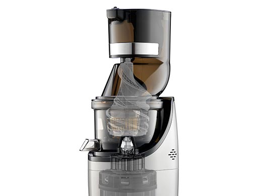 世界初。特許取得のワイド投入口で素材も調理も栄養もまるごと。りんごや皮を剥いたオレンジならまるごとそのまま投入でき、材料を細かく切る手間を省くことができます。クビンスのスロージューサーは低速回転で石臼のように圧力をかけて、ゆっくりとすり潰し搾汁します。刃が無いので摩擦熱が発生せず、熱に弱い水溶性のビタミンやミネラル、食物酵素などの栄養素を壊さず摂取可能です。また、野菜や果物をそのまま食べるよりも栄養素の体内吸収効率が良いのも特徴です。サラサラとした質感で飲みやすく、おなかにやさしい、素材本来の味と香り、栄養素をギュッと凝縮したより新鮮なコールドプレスジュースが楽しめます。