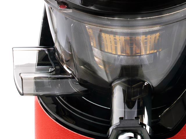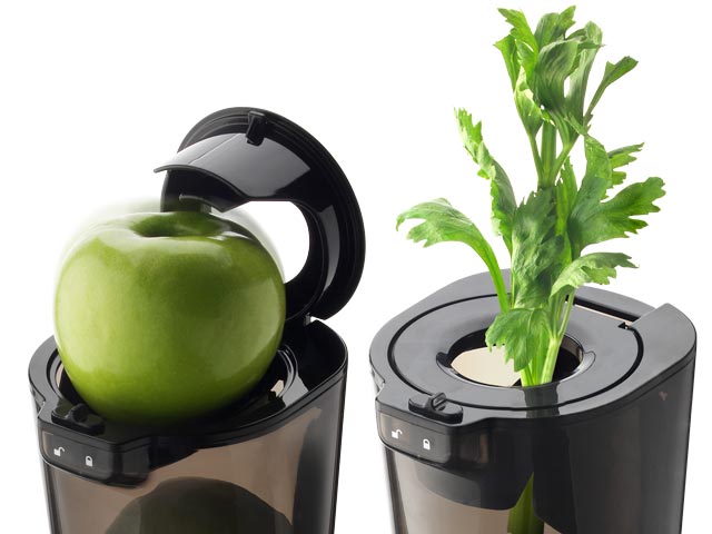 レザータッチのプレミアムなボティと材料をまるごと投入できる82mmのワイド投入口。デザイン性と機能性を兼ね備えたプレミアムホールスロージューサーです。